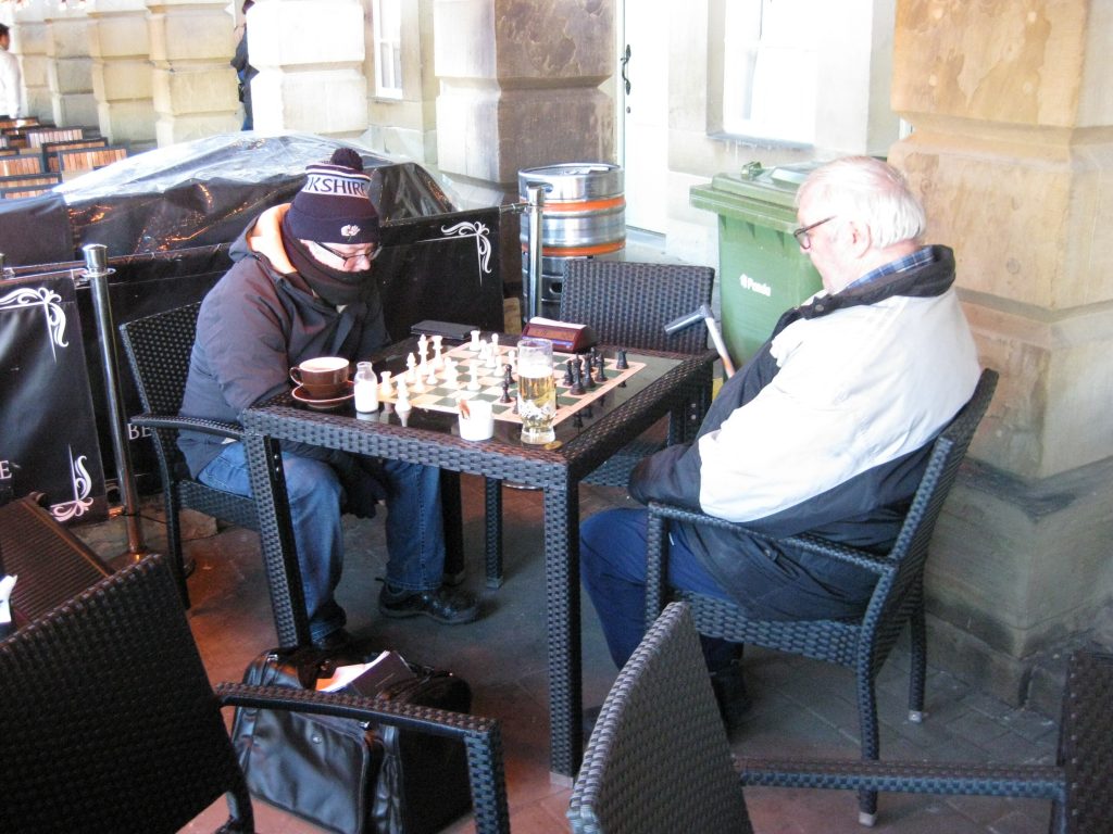 It was a moment of epiphany. Ian was right, what kind of maniac sits outside for 4 hours in temperatures of -2 at the Halifax Piece Hall to play chess? 24 lunatics of course, from Kirklees and Calderdale Clubs.